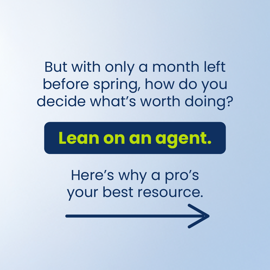 What projects are on your to-do list before selling? With only a month left before spring, let’s connect so you know what’s worth the time and effort. Now’s the time to get started on any repairs or upgrades that you want to tackle before you do.